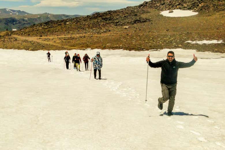 When you least expect it, we'll reach our destination: the boundary marker X-5, better known as Hito Copahue. This point is the natural frontier between Argentina and Chile, surrounded by snowy peaks and a valley of arid hills. You'll be able to place one foot in Argentina and another in Chile! Of course, we'll celebrate our achievement with a comforting warm drink before beginning our return journey.