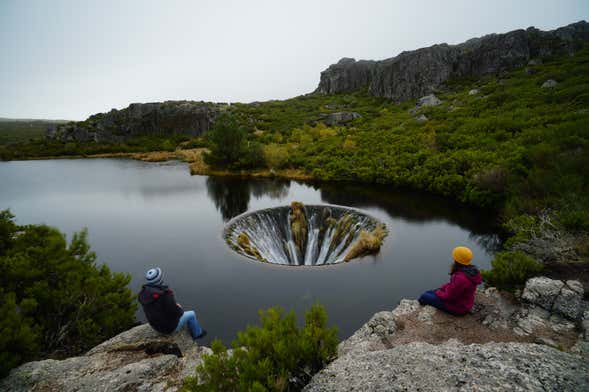 From there, we'll start our route on foot, approximately 4.3 kilometers (2.6 miles), where we'll reach Covão dos Conchos. We'll explore the secrets tucked away in this little spot in the middle of the lake, where gallons of water drop daily.