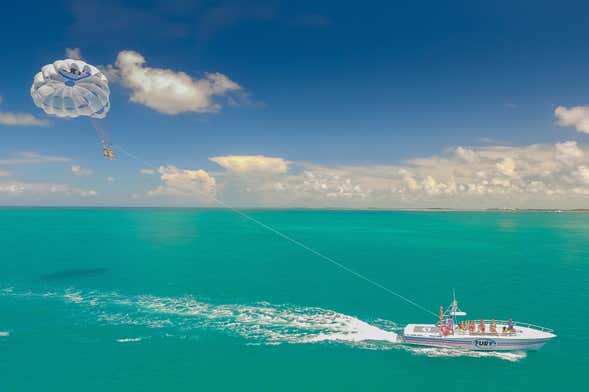 When we arrive at a safe point on the coast, you'll put on a safety harness and the appropriate equipment to enjoy an 8-10 minute parasailing flight over the warm, crystal clear waters of the Florida coastline.