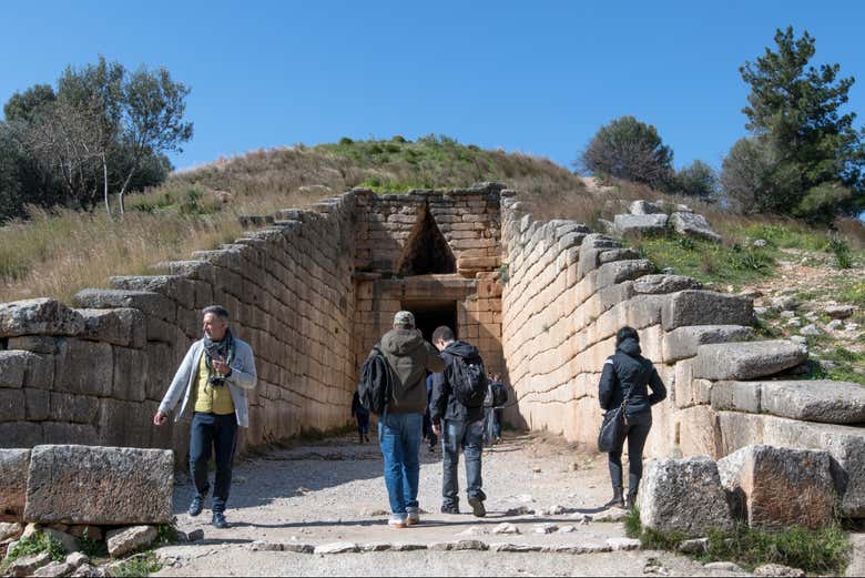From there, you'll pass the ruins of the royal Palace of Agamemnon and the Treasury of Atreus, also known as the Tomb of Agamemnon. This circular building is an emblem of Mycenaean architecture, characterised by the "Tholos" shape, like most Greek funerary monuments. You'll also see that Mycenae is surrounded by a great wall which, according to local tradition, was built by the Cyclops.