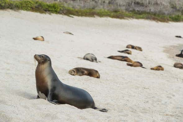 At the time you choose, we'll pick you up from your hotel on San Cristobal Island. There, we'll board a comfortable minibus to leave the city behind and head towards La Lobería beach, one of the most impressive areas of the island.