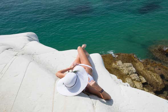 Navegaremos por el Mediterráneo y haremos una parada para nadar en un lugar muy especial: la Scala Dei Turchi. Esta formación rocosa se caracteriza por sus blancos acantilados de piedra calcárea, que crean un bello contraste con el azul intenso del mar.