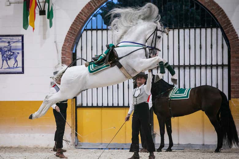 Con vuestra entrada, asistiréis a una velada de una hora y media en la que 20 caballos protagonizan diferentes números en los que realizan coreografías al son de música española. Estos bailes están basados en la doma clásica y vaquera, por lo que os llevarán a vivir un momento lleno del folclore andaluz más arraigado.