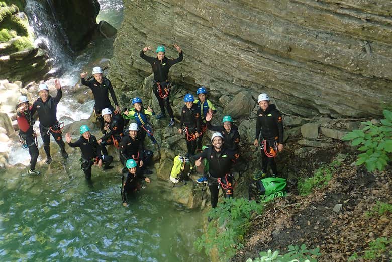 Con el equipo puesto, iniciaremos el descenso por el interior de un impresionante río encañonado en pleno corazón del Pirineo aragonés. ¿Qué os parece el paisaje que os rodea? Con la ayuda de cuerdas, superaréis grandes desniveles mientras disfrutáis de esta aventura. Nos deslizaremos a través de rampas naturales, treparemos por las rocas, saltaremos a pozas de aguas cristalinas y, por supuesto, ¡lo pasaremos en grande!