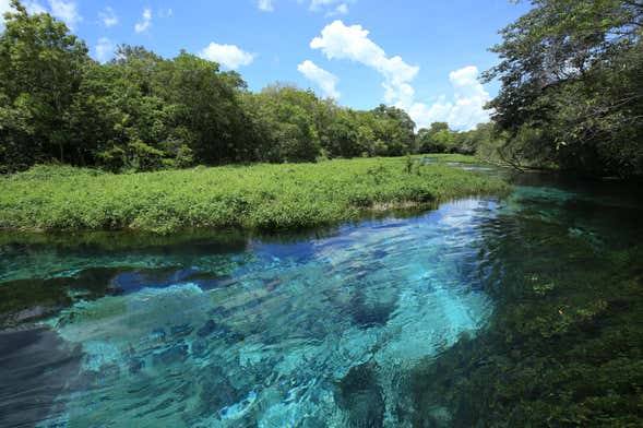 Subiremos a un barco ecológico y empezaremos a surcar los ríos Formoso y Sucuri admirando la frondosa naturaleza que brota en este enclave. El paseo en barco nos permitirá recorrer 1,3 kilómetros de estas aguas fluviales mientras el guía nos ayuda a identificar la flora y la fauna local. Es posible que monos, nutrias, tucanes y otras muchas especies hagan acto de presencia. ¡Preparad vuestra cámara!