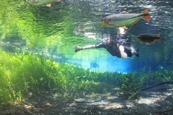 ¡Al agua! Empezaremos a nadar para descubrir la rica biodiversidad de este paraje natural. Cientos de peces y vegetación fluvial estarán presentes durante la ruta por estas aguas. ¿Queréis saber por qué el río Baía Bonita tiene unas aguas tan claras? La piedra caliza y los reflejos del sol tienen mucho que ver. ¡Os desvelaremos todos los detalles mientras hacemos snorkel!