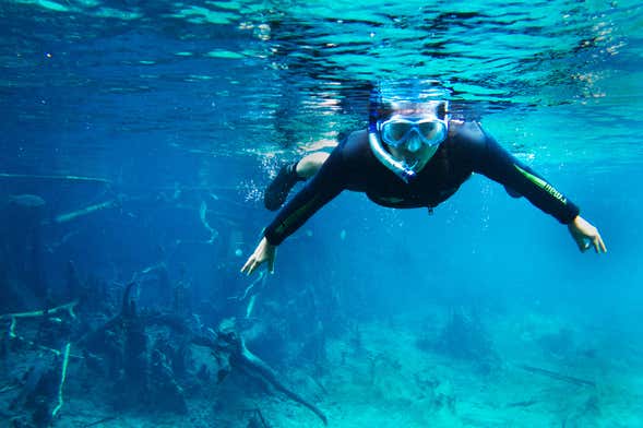 Nos equiparemos con el traje de neopreno y empezaremos a adentrarnos en el bosque ribereño hasta llegar al nacimiento del río Olho d'Água. Nos colocaremos las gafas y el tubo de snorkel y nos zambulliremos en la piscina natural de este arroyo.