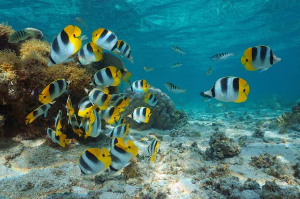 Iniciaremos la travesía por la laguna azul y surcaremos las aguas en busca de sus simpáticos habitantes. Durante el trayecto podremos observar multitud de peces tropicales de colores y enormes formaciones de coral. Además, puede que nos topemos con mantarrayas, tortugas marinas e incluso tiburones.