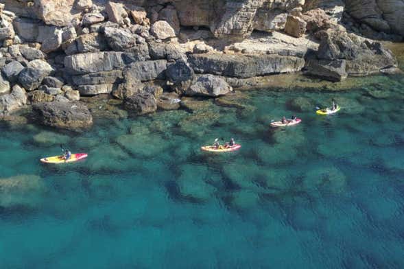 En este tour en kayak por Cala Codolar​ llegaremos hasta playas vírgenes inaccesibles por tierra y disfrutaremos de la sorprendente vida marina de la isla de Ibiza.