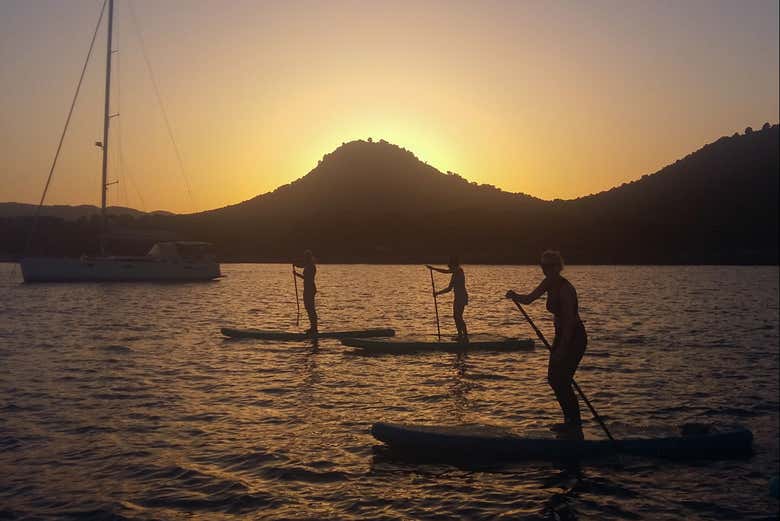 Una vez estemos todos, asistiremos a una breve clase introductoria para aprender a utilizar las tablas y los remos. Con la lección aprendida, nos lanzaremos al agua y remaremos mientras el sol empieza a teñir de tonos anaranjados el horizonte. ¡Está comenzando a atardecer!