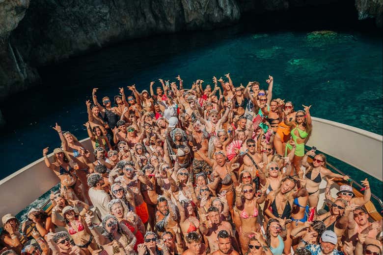 Dos horas después, pondremos de nuevo en marcha los motores para navegar hasta una gruta secreta. ¿Alguna vez habéis estado de fiesta en una cueva? ¡Preparaos, porque este es el broche de oro perfecto! Participaréis en juegos, os podréis decorar el cuerpo con luces de neón y… ¡a bailar hasta el final!