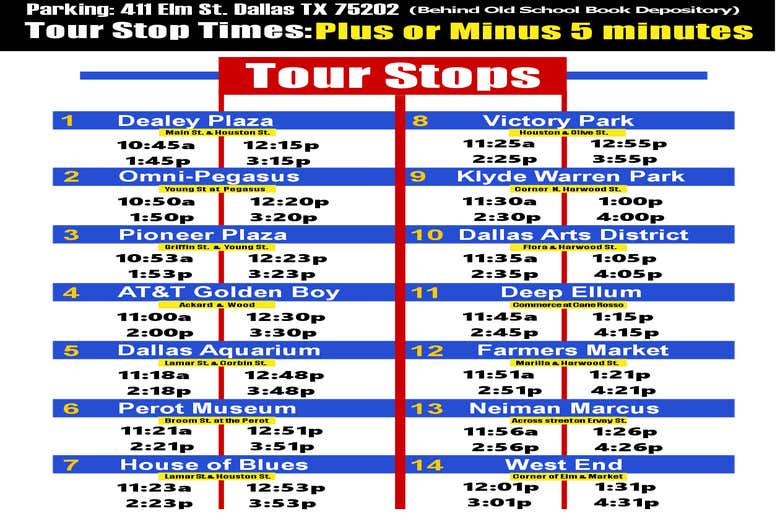El trolebús turístico de Dallas sale de Dealey Plaza todos los días a las 10:45, 12:15, 13:45 y a las 15:15 horas. No obstante, en el siguiente enlace podéis ver los horarios del trolebús turístico de Dallas.