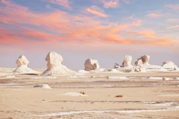 Desde este lugar, iniciaremos un recorrido de unos 160 kilómetros por el Desierto Blanco. Aquí nos detendremos en Crystal Mountain, formada por pequeños fragmentos de cuarzo que brillan a la luz del sol, el valle de Agabat y El Sharkia. ¡Momento foto!
