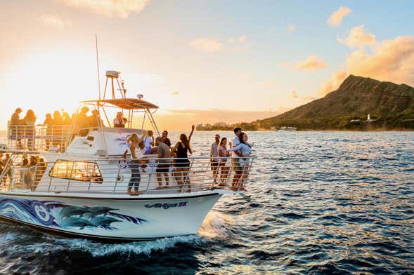 Nada más embarcar, el DJ comenzará a pinchar la música para que podamos bailar y disfrutar de la fiesta a bordo del barco. Durante la travesía, veremos cómo el atardecer se dibuja en el horizonte de Honolulu. Además, podréis acercaros al bar del barco para comprar alguna bebida.