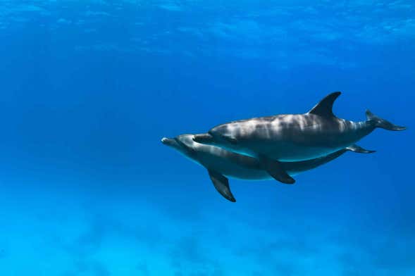 Cuando encontremos la mejor zona de avistamiento, fondearemos el barco, cogeremos el equipo de snorkel y saltaremos al agua para nadar con ellos. Seguro que se acercan curiosos a pocos metros de vosotros. ¡Será una experiencia única!