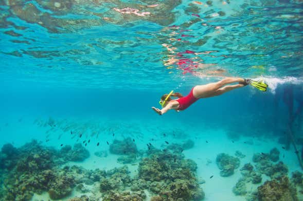 A continuación, nos refrescaremos con la práctica de snorkel en las calas de Edoume. Ataviados con las máscaras, tubos y aletas, exploraremos los extraordinarios paisajes marinos de los alrededores. ¿Avistaremos algunos pequeños peces durante la inmersión? ¡Seguro que sí!