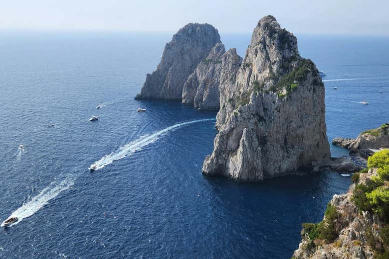 En Capri, no podéis dejar de pasear por la famosa Piazzetta de Capri, el corazón de la isla, un lugar vibrante donde locales y turistas se mezclan. Muy cerca, los impresionantes Farallones, tres imponentes formaciones rocosas que emergen del mar Tirreno, se alzan majestuosos, regalando unas vistas espectaculares, especialmente desde los Jardines de Augusto.