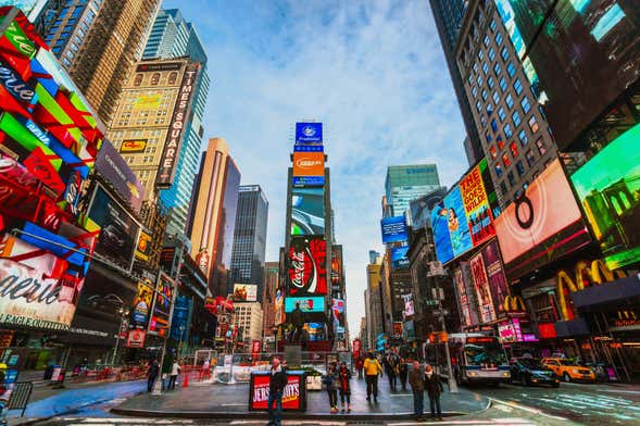 La ruta seguirá después por la zona de Broadway y Times Square. ¡Momento foto! Por supuesto, tendremos tiempo para hablar sobre la arquitectura de estilo Art Decó mientras identificamos los logos de grandes marcas en los diferentes edificios de la plaza.