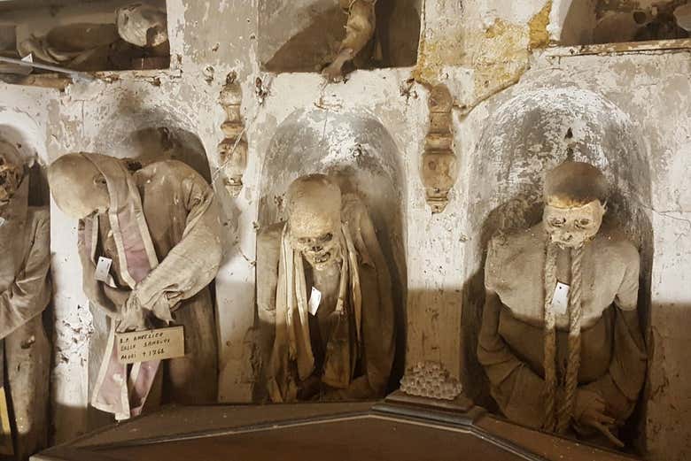Las momias fueron colocadas en pasillos distintos según el género, el estatus social y la profesión. El núcleo más antiguo lo constituye el corredor de los Frailes Capuchinos, que visten el hábito típico de su orden. Además, aquí se encuentra una sala dedicada a los prelados, ataviados con suntuosos hábitos sacerdotales.
