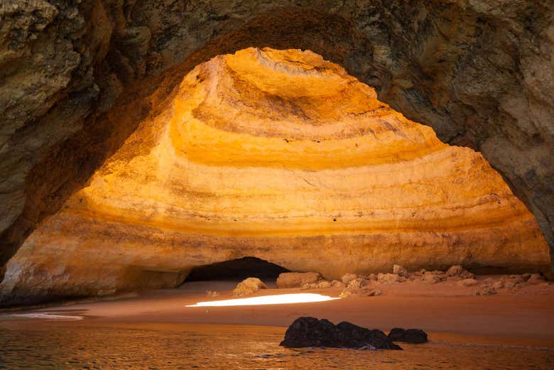A continuación, nos adentraremos con la lancha en las famosas cuevas de Benagil, a las que solo se puede acceder en barco. Os maravillaréis con el óculo de su parte superior, que crea un hermoso haz de luz que llega hasta la arena de la playa de la cueva.