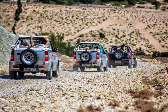 Nos dirigiremos a las montañas de Rodas, donde atravesaremos sus senderos a bordo del 4x4, la mejor forma de descargar adrenalina y contemplar paisajes inolvidables al mismo tiempo. Baches, riachuelos, curvas y cuestas serán nuestros compañeros de viaje. ¡Una auténtica aventura!