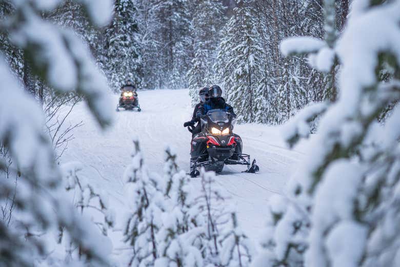 Llegaremos a nuestra primera parada, el Pueblo de Papá Noel, donde os asignaremos las motos de nieve y nos equiparemos con todo lo necesario para la aventura. Con el rugir de los motores, surcaremos el manto blanco de Laponia durante una hora y 20 minutos. Nos sumergiremos en senderos silenciosos, solo interrumpidos por el crujir de la nieve al paso de los vehículos.
