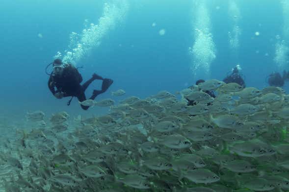 Comenzaremos a desinflar los chalecos para sumergirnos y, a poca profundidad, el instructor nos enseñará algunas sencillas técnicas para que comencéis a manejaros con soltura con el equipo. En unos pocos minutos os moveréis como pez en el agua.