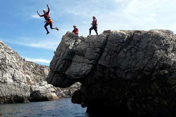 Tras un trayecto de entre 30 minutos y una hora, dependiendo del punto de partida, llegaremos a la costa del Parque Natural de la Arrábida. En esta zona del litoral portugués descargaremos adrenalina con una emocionante actividad de coasteering. Para ello, saltaremos, nadaremos y nos deslizaremos por tirolinas sobre el agua.