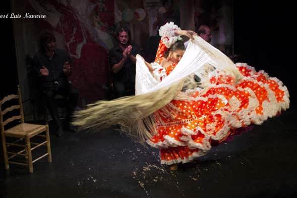 A través de un patio de azulejos sevillanos accederéis al Teatro Flamenco Triana, un lugar consagrado al cante, el baile y la guitarra. A la hora indicada, empezarán a sonar los primeros acordes de guitarra. ¡Comienza la función!
