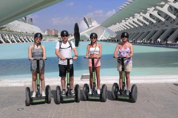 Comenzaremos el tour en el número 6 de la calle Náquera. Desde allí bajaremos por los jardines del Turia hasta los edificios diseñados por Santiago Calatrava. En nuestro paseo en segway por la Ciudad de las Artes y las Ciencias de Valencia recorreremos el conjunto arquitectónico formado por el edificio de la ópera (Palau de les Arts Reina Sofía), el cine IMAX en 3-D del Hemisfèric, el Museo de las Ciencias Príncipe Felipe y el Àgora. Tras dar un paseo en segway por los alrededores del Oceanogràfic y los modernos jardines de L'Umbracle, subiremos de nuevo paralelos al antiguo cauce del río Turia para regresar a las Torres de Serranos.
