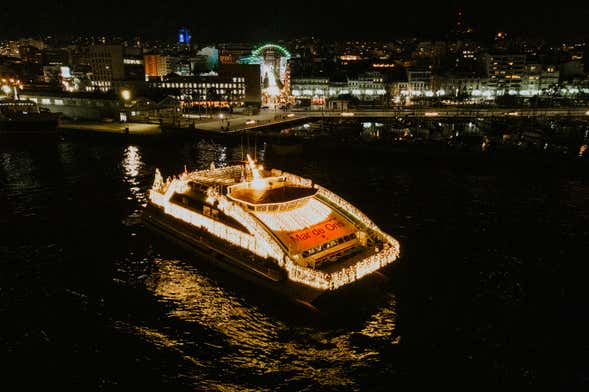 Tras un cóctel de bienvenida y ambientarnos con la música navideña de la mano de un DJ, disfrutaréis de un paseo nocturno por la ría de Vigo en un barco al que no le falta detalle, ni en su exterior ni en sus instalaciones interiores: luces por doquier, árboles de Navidad, villancicos y hasta un set donde conocer a Papá Noel, al Grinch o al paje real. ¿Qué más se puede pedir? ¡Habrá muchas más sorpresas!