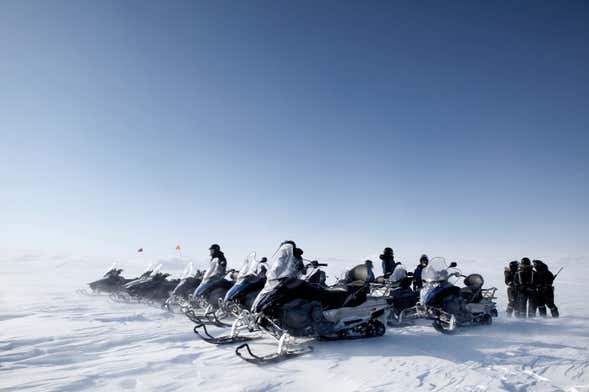 Tras recogeros en vuestro hotel de Yellowknife a las 11:00 horas, nos dirigiremos en minibús hacia las afueras de la ciudad. Nos detendremos en unos parajes helados alejados del núcleo urbano. ¡Desde este punto comenzaremos el tour en moto de nieve!