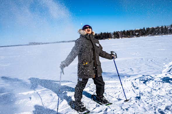 Daremos un paseo por las orillas del lago. Gracias a los bastones y a las raquetas de nieve, accederemos más fácilmente a ciertos terrenos que de otro modo resultarían impracticables. Mientras disfrutamos de los paisajes helados del Great Slave Lake también veremos algunos ejemplares de la fauna local, como los zorros y perdices nivales.
