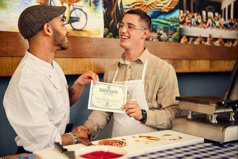 Pendant que vos créations refroidissent, vous profiterez d’une pause bien méritée avec une tasse de thé ou de café. Une fois prêts, vous pourrez déguster l’un de vos délicieux stroopwafels sur place et emballer l’autre pour l’emporter. Cerise sur le gâteau : vous repartirez avec un certificat attestant de vos nouvelles compétences en fabrication de gaufres !