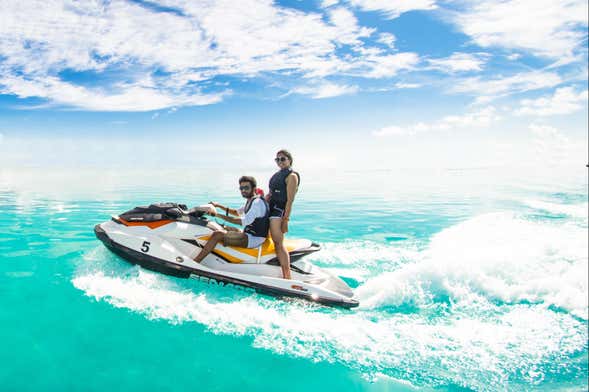 Si vous n'avez jamais piloté de jet-ski, ne vous inquiétez pas, ce n'est pas difficile ! Vous commencerez à naviguer sur les eaux de la baie de Palma en suivant le guide qui se déplacera à bord d'un autre jet-ski.