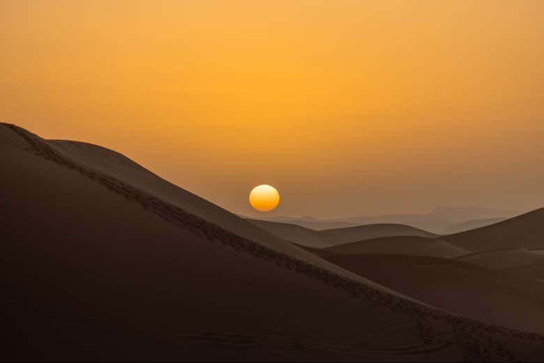 Ma il meglio deve ancora venire! A seconda dell'orario scelto per l'escursione, inizierete a vedere i colori dell'alba o del tramonto all'orizzonte del deserto. Arancioni, oro, rosa... La tavolozza dei colori sarà incredibile! Approfittate del momento per scattare una foto. Il ricordo più bello, tuttavia, rimarrà impresso nella vostra retina!