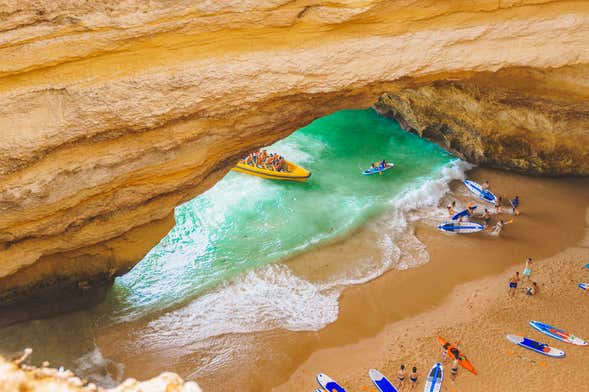 Remando, approderemo a questa famosa grotta dell'Algarve, dove conosceremo da vicino le peculiari formazioni rocciose di questo tratto della costa portoghese. La più famosa di tutte è senz'altro la cosiddetta Cattedrale di Benagil, una cavità in cui la luce filtra da un'apertura della volta rocciosa, creando incredibili giochi di luce. Chi ha voglia di fare un bagno in questo scenario magico?