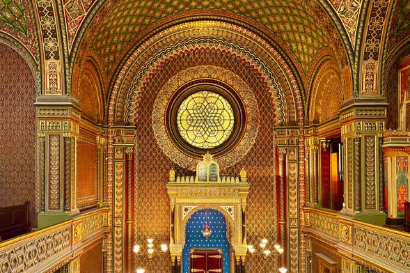 Dopo la visita del cimitero, proseguiremo dunque in direzione della Sinagoga Spagnola, la più recente di tutto il ghetto di Praga, le cui volte ricordano quelle dell'Alhambra di Granada. Ecco spiegato il nome! Successivamente, esploreremo la Sinagoga Maisel, un tempio del Cinquecento che conserva una vasta collezione di oggetti ebraici, come libri, tessuti e manufatti d'argento, in cui avremo modo di approfondire ulteriormente la storia degli ebrei.