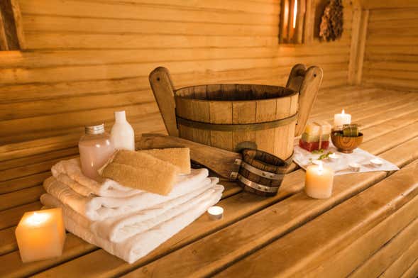 La sauna finlandesa è formata da una cabina in legno che si riscalda con legna e dove si può raggiungere la temperatura di 70º C. Arrivati sulla porta, vi spiegheremo cosa fare.
