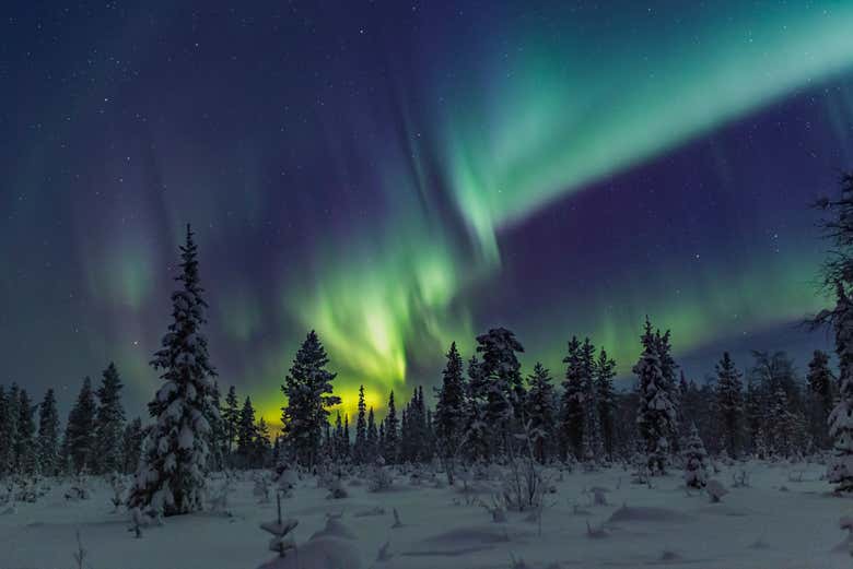 Saliremo a bordo di un minibus e ci inoltreremo nelle foreste di Saariselkä senza perdere di vista il cielo artico. La guida ci condurrà nel luogo migliore per osservare la danza dell'aurora boreale.