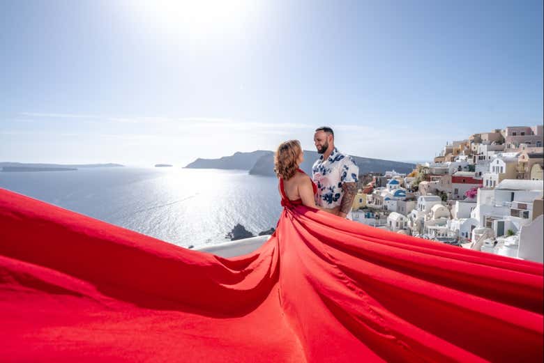 Un fotografo vi farà sentire come vere modelle mentre posate per le strade di Santorini. In fase di prenotazione, potete scegliere se farvi fotografare con i vostri abiti o con un vestito con strascico in tessuto leggero. L'ideale per fare un tocco ancora più suggestivo alle vostre foto!