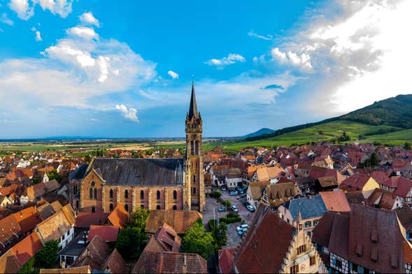 Próxima parada? Hunawihr! Percorrendo este pequeno povoado da Alsácia, sentiremos que voltamos no tempo. Passaremos por sua prefeitura renascentista, sua praça principal e sua igreja medieval. Você sabe de onde vem o nome da localidade? Vamos descobrir ao longo do tour, assim como muitas outras curiosidades.