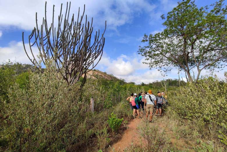A trilha que nos levará ao leito do Rio Paraíba atravessa a caatinga, cujo nome significa mata branca em Tupi. Você sabia que esse é o único bioma 100% brasileiro? Durante o trajeto, faremos paradas em sítios arqueológicos onde os índios tapuias se estabeleceram e deixaram registros que podem ser vistos até hoje. As inscrições, gravadas com tinta vermelha, comprovam a existência da antiga aldeia indígena.