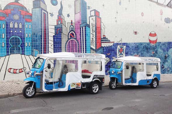 Na hora indicada, nos encontraremos no Largo do Regedor, atrás do Teatro Nacional D. Maria II para subir a bordo de um tuk tuk, o veículo original com o qual percorreremos as ruas de Lisboa. Essa moto-táxi típica do sudeste asiático encontrou seu lugar na capital portuguesa, convertendo-se em um dos meios de transporte mais utilizados pelos turistas. Graças ao seu teto aberto e à ausência de portas laterais, o tuk tuk é a melhor opção para se desfrutar um roteiro panorâmico por Lisboa.