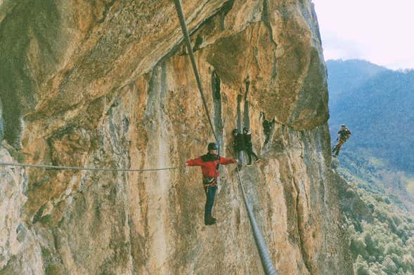 Iremos ao ponto de início da via ferrata de Camaleño, considerada por muitos uma das melhores da Cantábria. Você não acredita? Então, terá que comprová-lo ao vivo! Durante a atividade, desfrutaremos de um trajeto curto, mas intenso em que atravessaremos uma ponte tibetana e escalaremos uma parede vertical, de onde teremos vistas privilegiadas dos Picos de Europa.