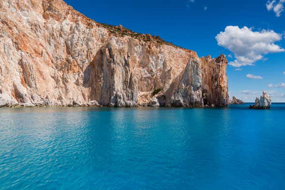 Iremos rumo ao cabo Vani, onde veremos uma antiga mina utilizada no século XIX. Durante a travessia, apreciaremos também a baía de Triades e Ayios loannis e chegaremos à primeira parada do tour: Sykia. Você sabia que é a maior gruta de Milos? Impressionante!