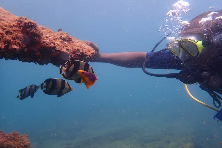 Em seguida, nos equiparemos com a roupa, o pé-de-pato, a máscara e a bomba de oxigênio e teremos um primeiro contato com a água para colocar em prática o que nos foi explicado anteriormente. Dessa maneira, quando estivermos preparados, começaremos a descer pouco a pouco até alcançar aproximadamente 10 metros de profundidade e viver uma experiência submarina durante 40-50 minutos. Você ficará encantado!
